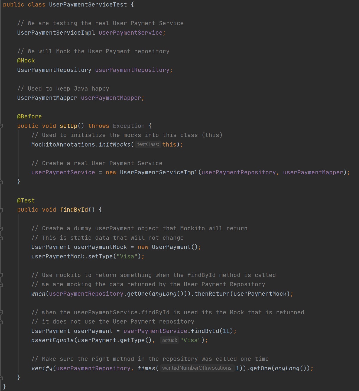 In the below example the User Payment Service uses the User Payment Repository to retrieve data from the database, however we want to use Mockito to provide a dummy User Payment object that the Repository service would normally return from the database. So we Mock the User Payment Repository and if the getOne() method is called Mockito will step in and return the dummy User Payment object that we created, and thus no database access took place speeding up the test and only testing the service layer, we don't even need the database running. I have added many comments to the code below to describe what is happening. One point to notice the MockitoAnnotations.initMocks(this); statement, this initializes the mock objects (@Mock annotations) and is required, also you can confirm that the Mock Repostory was called by the service layer using the verify and times method.