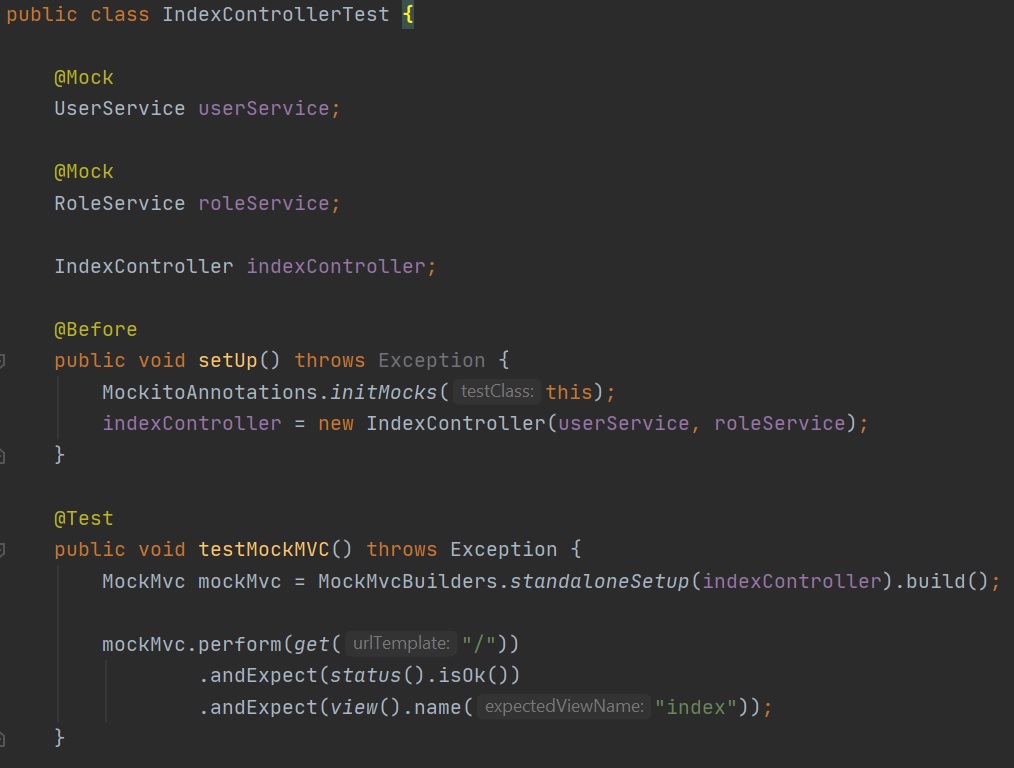 use can even test controllers by using the MockMvcBuilders.standaloneSetup() method, it builds a MockMvc instance by registering one or more @Controller instances and configuring Spring MVC infrastructure programmatically. We can then perform a HTTP method (full API tester - get, put, push, etc) and test if the return code is correct that the correct veiw was used, etc, Note that its still mocking the MVC as in standaloneSetup the MVC is not actually running. There are two methods that you can use