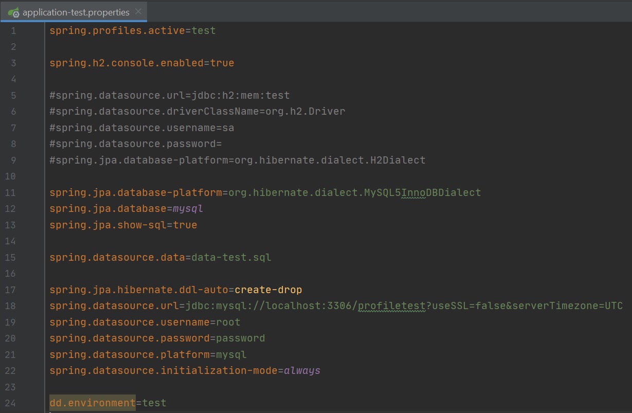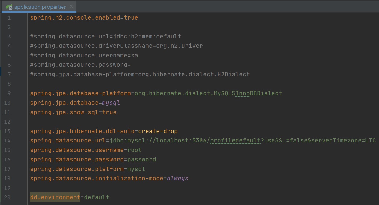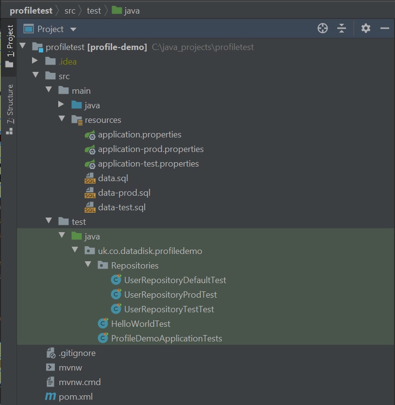 The default property file points to a profiledefault database, I also have a variable called dd.environment set to default if no profile is set then this will be used as the default. The test property file states it can be used by a test profile at the top (spring.profiles.active), we also set it to use a profiletest database and the dd.environment is set to test, also I have specified a data load script using the spring.datasource.data propery pointing it to data-test.sql