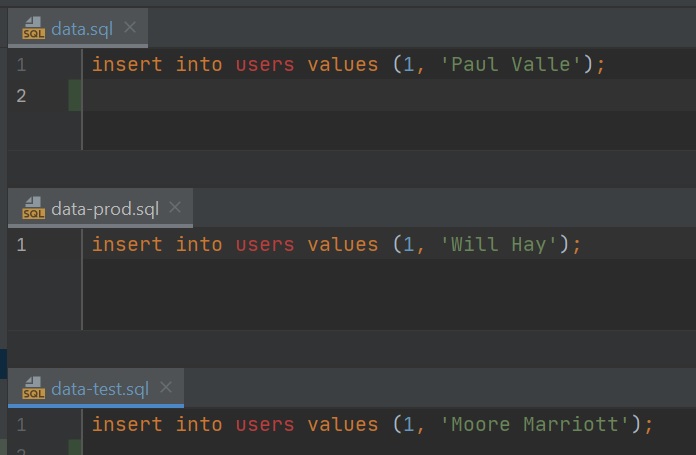 I also have 3 different data load files data.sql (default profile), data-prod.sql (prod profile) and lastly data-test.sql (test profile).