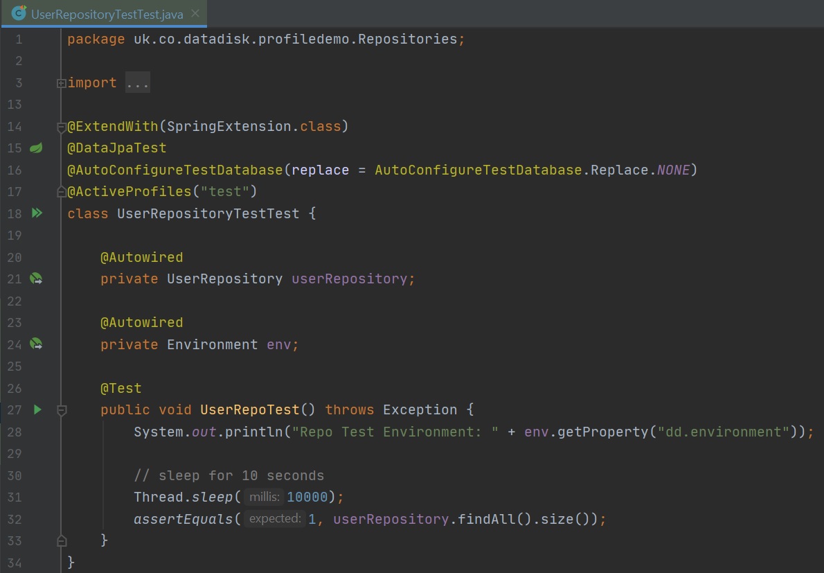 The next example is using profiles, as you can see I use the @ActiveProfiles annotation to use the test profile and the test data load file, this time I also use the @DataJpaTest annotation which is used to test JPA repositories, however its uses an embedded databse and hence the override by using the @AutoConfigureTestDatabase annotation (overcome datasource errors), by using profiles the classpaths are automatically added so no need to add any classpath details, and its very easy to switch profiles and use different properties or databases.