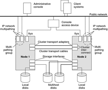 Below is a diagram of a Sun cluster setup, both nodes have IP network multipathing, they both access to the data disks (multihost disks), and both have cluster interconnect network which is used by the nodes to talk to each other.