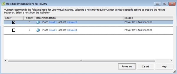 So lets get some recommendations going, if you look in the above screen shot I already have a VM running (windows_2008) on vmware1, so when I try to power on VM linux01, DRS kicks in and the recommendation screen appears, it already knows that I have a VM running on vmware1, so it suggests that i should power this on the other ESXi server (which has nothing running), I am going to ignore this and continue to power it on vmware1