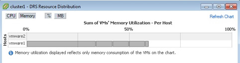 You can also see cluster imbalances from the summary screen on the cluster, if you look in the VMware DRS panel you can see 1 recommendation and a warning icon, if you click on the "View resource distribution chart" you can see that vmware1 does ever slow slightly has a red part on the graph, thus the warning and recommendations.