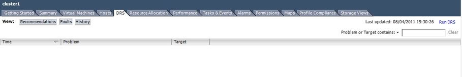 If you select the DRS tab then the faults button, you get the screen below, from here you can see if there has been any problems regarding DRS, problems might be incompatibility problems, rules that have been violated, insufficient capacity to move VM, I don't have any faults but here is a screen shot of the faults page