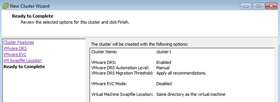 DRS configuration (manual mode) | First we have to create a cluster by selecting the "new cluster" icon Enter the cluster name and select "Turn on VMware DRS" only, we will be covering HA later. Now I select manual as I want full control You can use power management features like wake-on-LAN or ILO, I select off for the time being as we will be covering power management later Again i will cover Enhanced vMotion compatibility later in this section, so disable it for the time being We will keep the VMKernel swap in the same directory as the VM Finally we get to the summary screen Before we start to add ESXi server to the cluster I just want you to see a few things, if you notice in the general panel DRS is on but we have no resources available as we have not added any ESXi servers to the cluster, also the VMware DRS panel is a bit sparse as well We can add a ESXI server to the cluster by simply dragging and dropping a ESXI server, when you do this the following screen appears, here I select to choose to use the root resource pool You then a summary screen After adding both my ESXi servers in to the cluster we can clearly see the resources available increase, there are now 2 hosts, 4 CPU's and total memory and CPU resources available, also the DRS panel has come alive, there are no recommendations yet but that is because we have hardy any VM's powered on |