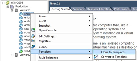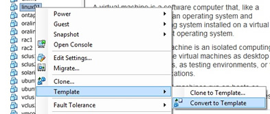 You will see that that VM disappears from the list and appear in the "VM and Templates" list, you can drag and drop the linux01 template to your template area That's' all there is to it, to convert back into a VM just right-click on the template select "Templates" and then select "convert into virtual machine", you will be asked a couple of easy questions (what ESXi server you want it to be deployed to). |