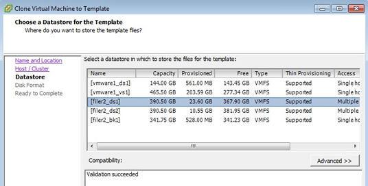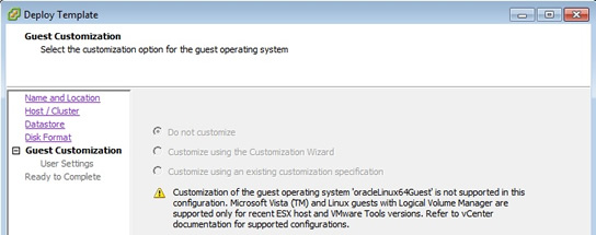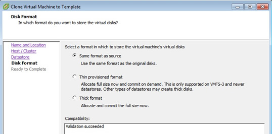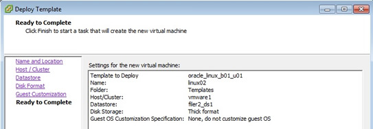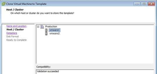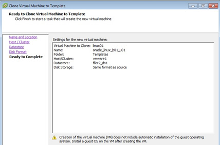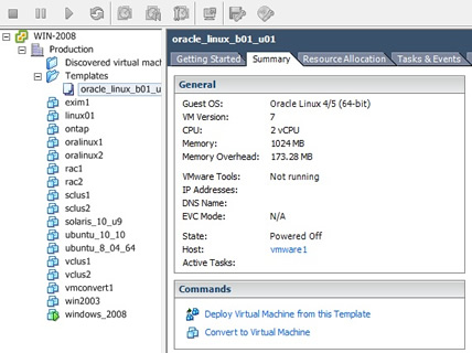 Cloning to a Template | I am going to use the Linux VM we created earlier as a template, normally I would update it with the latest patch set and install any software at all Linux VM's would require, backup agent, BB monitoring (Big Brother), etc. Select the VM you have powered off as you source for the template, right-click the VM and select "Template", then select "Clone to Template" Enter a friendly name for your template, I have called mine oracle_linux_b01_u01 (b = build, u = update), I have also selected my template folder I created Select the Host/Cluster that you want to store the template on, at this point you may get some errors like the below if the VM that you are cloning may have any problems with it, in this case I have attached a ISO image to my CD/DVD drive, after I removed the attached ISO image from the CD/DVD drive it all worked Select the physical location for storing the template files, I have put this on some shared iSCSI storage called "filer2_ds1" Choose the disk format, I have choose "Thin provisioned format", thus cutting down the disk required, if you need more information on disk provisioning then see my virtual machine section Lastly we get to the summary screen If you go to the templates and take a look at the newly created template you can see that you cannot power on this VM, you can only deploy it to a VM or convert it to a Virtual Machine. If you need to update this VM you need to convert it to a virtual machine, power it on then update it, power it off, then convert it back to a template