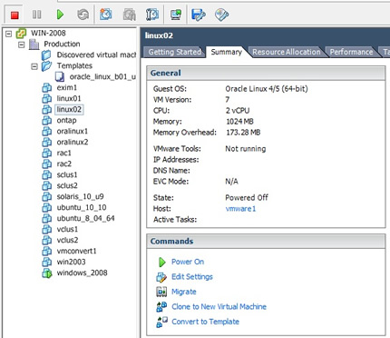 Now when you look at your VM you should see the newly create linux02 VM. At this point it is just like a normal VM, you may need to change the network, CD, etc. Also when you power on the VM you may need to change the IP address, etc for your environment |