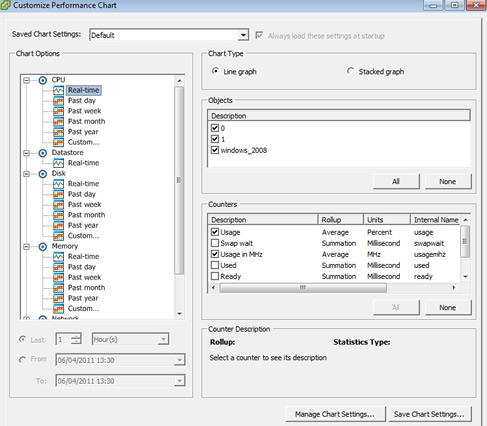 Disk | Internal tools of the guest OS can help here as well, as VMFS is so lightweight that it can be disregarded as the source of a bottleneck. Look at multipathing and make use you use the best method (round-robin?). Also look at memory if exhausted then the VM may be paging or swapping thus producing disk performance problems. When looking at the charts look for "Kernel disk command latency" which indicates the time on average that the VMKernel spent on each SCSI command (<2-3ms). Secondly look at "Physical device command latency" which measures the average time a physical device took to complete the SCSI command (<15-20ms). |
