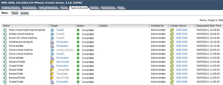 Next I want to cover viewing the events and tasks, before I move onto managing resources, the tasks and events tab is a record of all the tasks and events that have taken place, power on/off VM's, you can even see cloning, etc. This is a great source of information to see what has been happening in your environment.