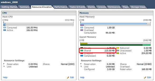 You can clearly see TPS in action on the resource Allocation tab of a VM if you look at the memory panel and the shared parameter, here you can see my Windows 2008 server is sharing 225MB of memory with other VM's.