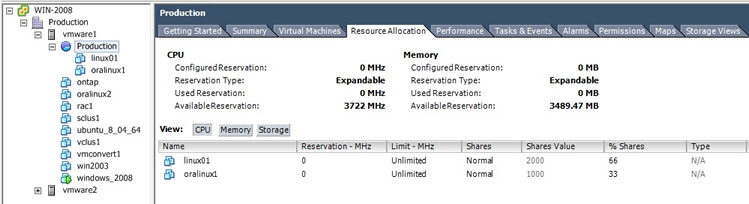 The proportional share system allows you to indicate that when a resource is scarce one VM or resource pool is more important than another. Share values can be applied on a per-VM basis or on resource pools, shares can act dynamically to resource demands, the share value can be specified by a number of by user friendly text like Normal, High and Low, remember though that shares only come into play when resources are scarce and contention is occurring. Many customers do not use the share system, it does require a bit on thinking to setup and to maintain, with cheap memory and CPU costs, most companies will purchase additional hardware, but when time are lean the share system can help.