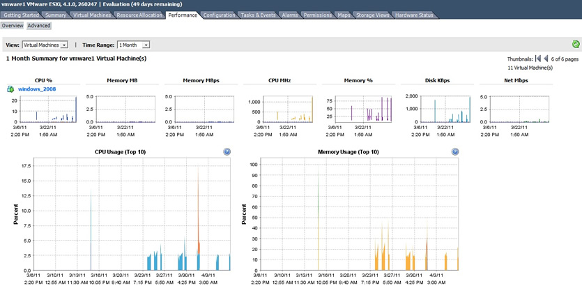 But if you really want very details performance information then we have to go to the performance tab (see image above), I am only going to gloss over these as you will be the ideal on what is available and what you have access to regarding the performance charts. The image below show you the overall performance of a particular ESXi server with a number of VM's, the information displayed is of a Windows 2008 Server but you can display all the VM's, you can also adjust the time range (you cannot do this on vSphere client), I have selected one month. You have CPU, Memory, Disk and networking information all on one screen.