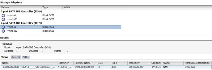 The below image is the 146GB I use for the ESXi O/S, it is attached to the vmhba0 controller and is of block SCSI type, I try to keep this purely for the O/S and keep all virtual machines off this disk.