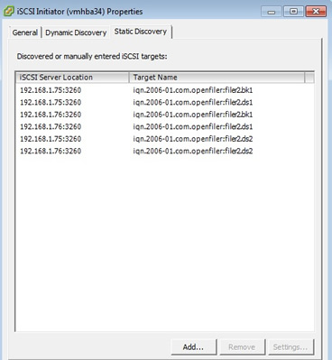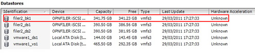 Lastly I want to talk about multipathing, I have setup my openfiler server to use two interfaces, to multipath all you do is carry out the above task "connecting ESXI to an iSCSI software adapter" for both IP addresses, after a rescan the "Static Discovery" tab you should display all the LUN's attached, in my case I have 3 LUN's of which each one is multipath'ed (hence why you see 6 targets).