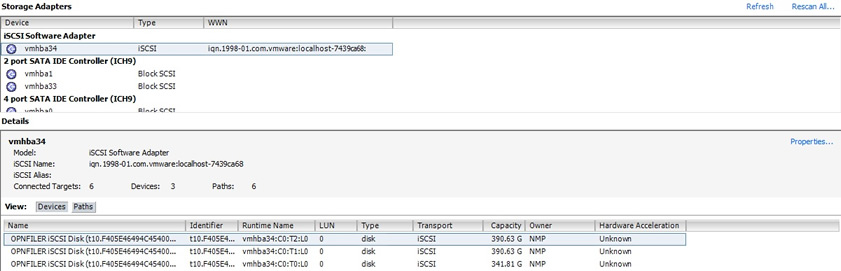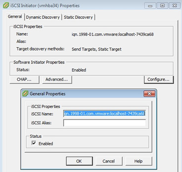 iSCSi has it own naming convention, its uses the iSCSI Qualified Name (IQN), it a bit like a DNS name or reverse DNS. The below image is my current iSCSI setup as mentioned in my test environment section I am using openfiler as a iSCSI server. The IQN name in my case is iqn.1998-01.com.vmware:localhost-7439ca68, it is configured the first time you configure the software adapter it can be changed if you want a different name.