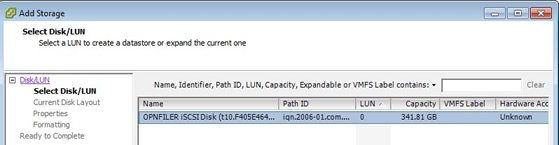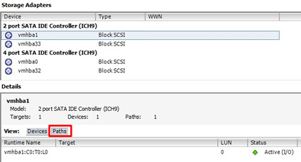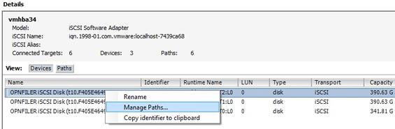 By selecting the paths tab you can expand to see how the disk is connected, if this device was multipath'ed you have all the paths listed here, as you can see we have one active path. We will setup a multipath device in my iSCSI section later and the various options that come with multipathing.