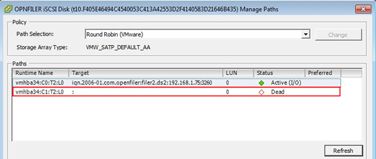 By default the ESXi server will use a fixed path for the I/O but you can change this, other options include "round robin" which would make use of both network adapters, just select the down arrow on the "path selection" then click on the change button to update, as you can see in the below image I have change this disk to use "Round Robin" both paths are now active and there is no preferred path.