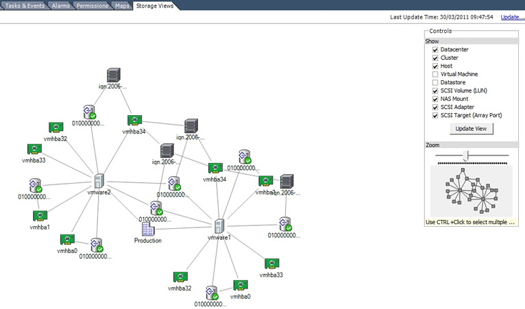 Another nice view in vCenter is the folder (my case the Production folder) -> storage view screen, here you can either look at the report or the maps, again the map has many options and it looks nice in your documentation.