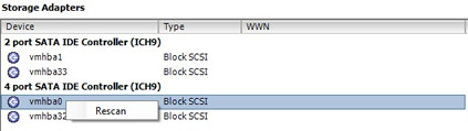 rescan from the commandline | esxcfg-rescan <adapter name> esxcfg-rescan vmhba1 |