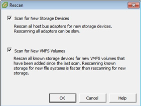 You can also rescan all controllers by selecting the "Rescan All..." icon in the top right-hand corner of the storage adapters tab, you get the options below, I generally tick both and then select OK, any new devices will then be added and can be used.