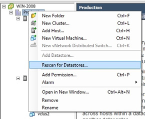 One problem with the older versions of ESX is that if you created a new LUN for 32 ESX servers you had to go into each one and rescan, version 4.1 you can use vCenter to rescan many hosts with a single click, just right-click the vCenter object (in my case it was called Production) and select "Rescan for Datastores", you may get a warning message as it may take some time to complete.