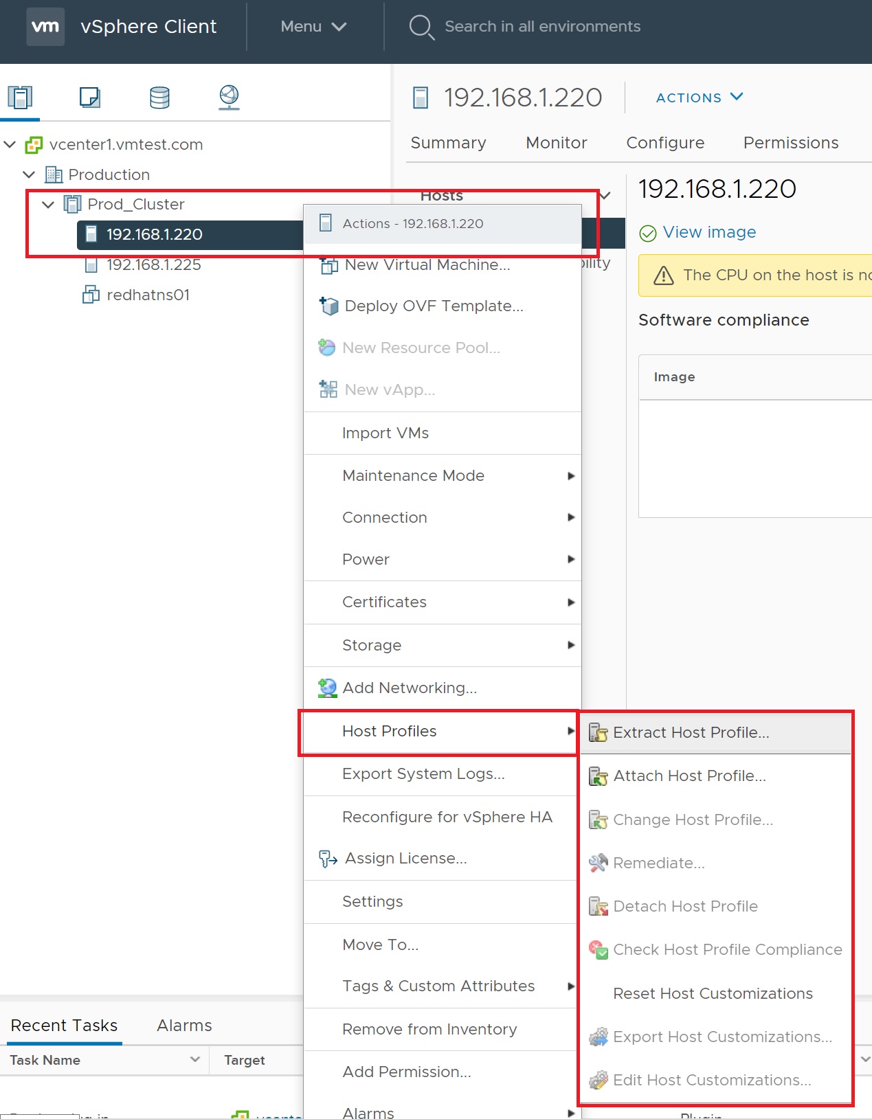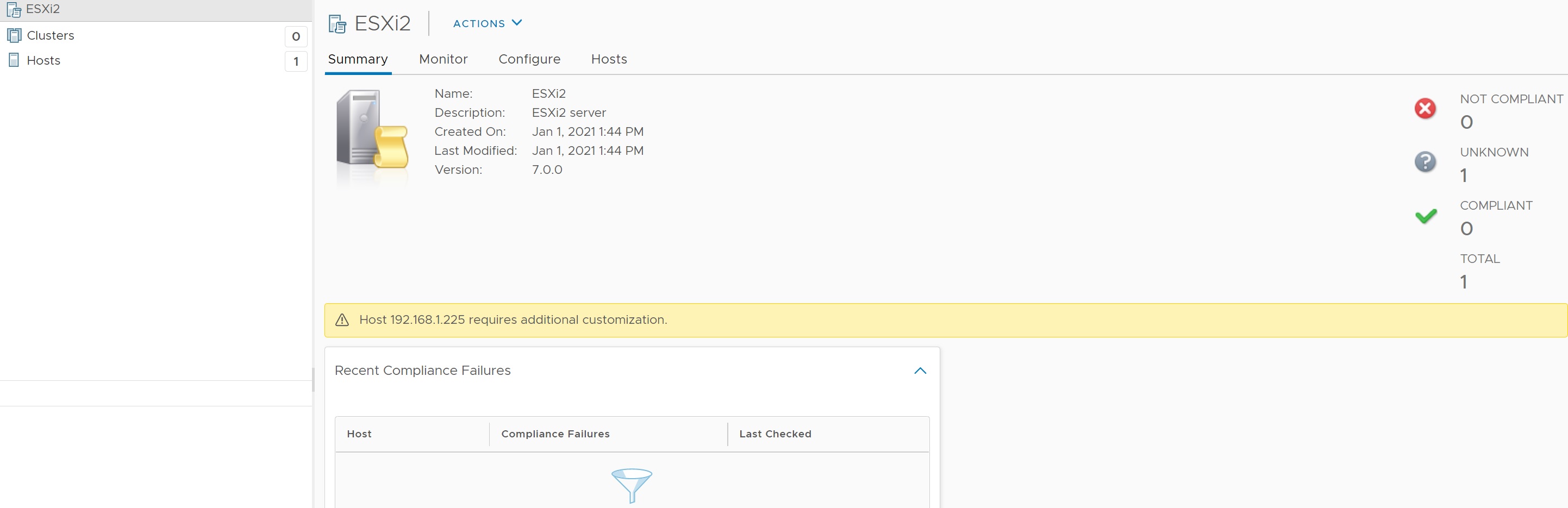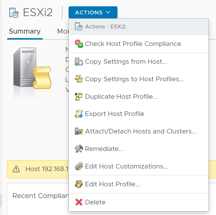 In the "Menu -> Hosts and Clusters" tab you can now see two ESXi servers host profile, you can apply this profile to a host or check its compliance, which is what we are going to do now, select each ESXi server in turn and click the "Check Host Profile Compliance" from the Actions drop down