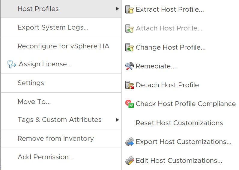 | Attaching and applying host profiles | To attach ESXi servers to you host profile, right-click the host profile and select "Attach Host Profile", Select the cluster or the ESXi server/s you want to attach