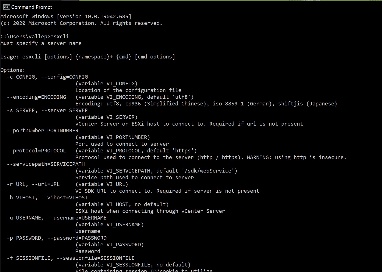 ESXCLI can be frustrating sometimes due to the authentication process (getting the certifcate working), it may take some time for the prompt to come back, all ESXCLI commands require a host (ESXi server or vCenter)