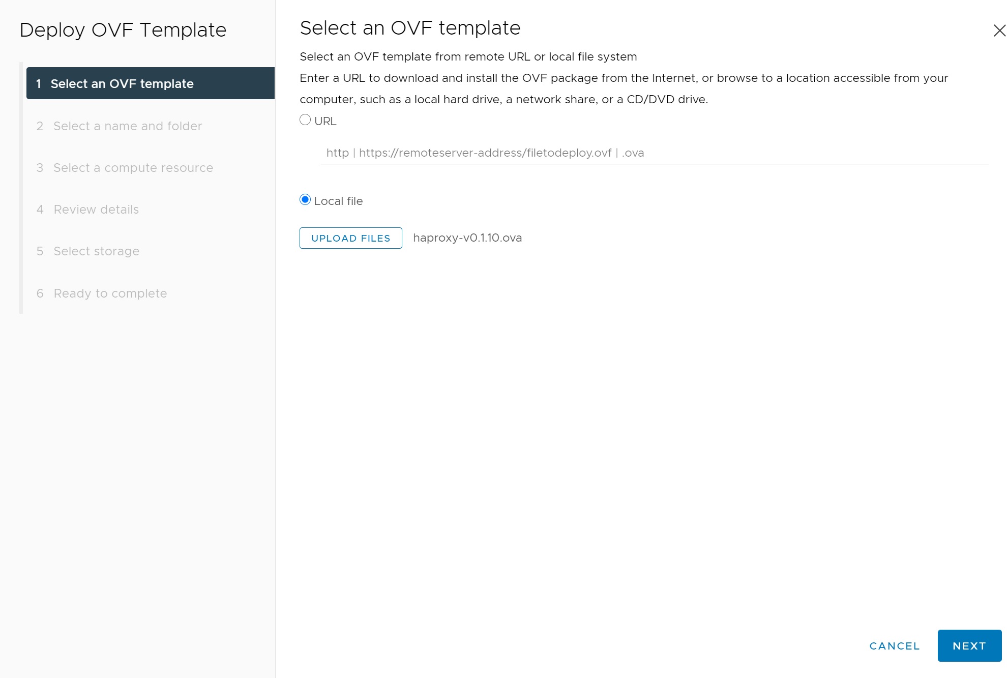 Then we need to setup a HAProxy, you can download from here, this is where most of the networking interaction will happen, if any network needs to access my internal network then it will go via the RedHat router. Now we will create the HAProxy VM, we select to deploy the template selecting the file