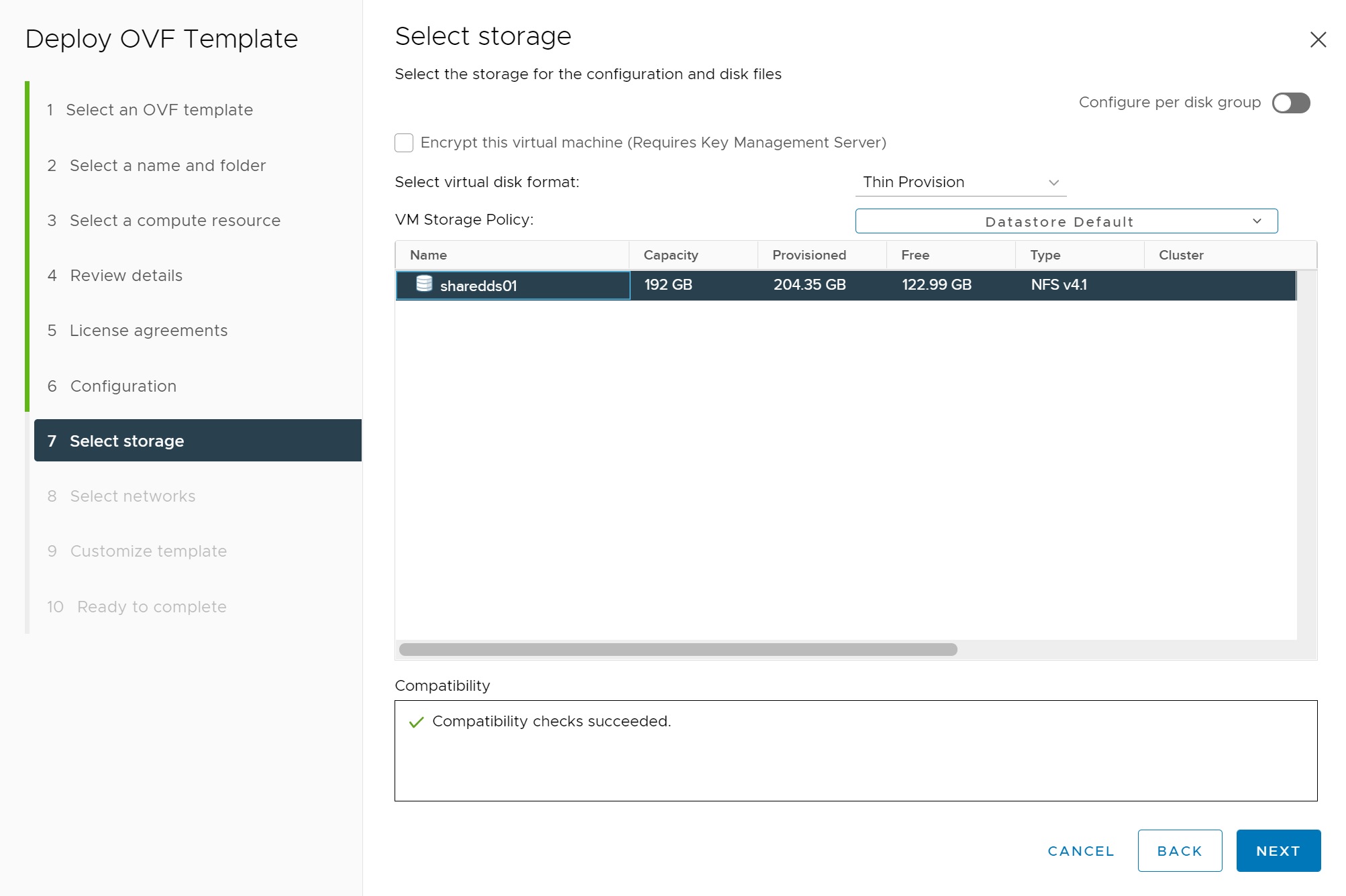 Next we select the storage policy, this is where the tag we created earlier comes into play, by using the tag on the sharedds01 datastore it will be picked up as a usable datastore.