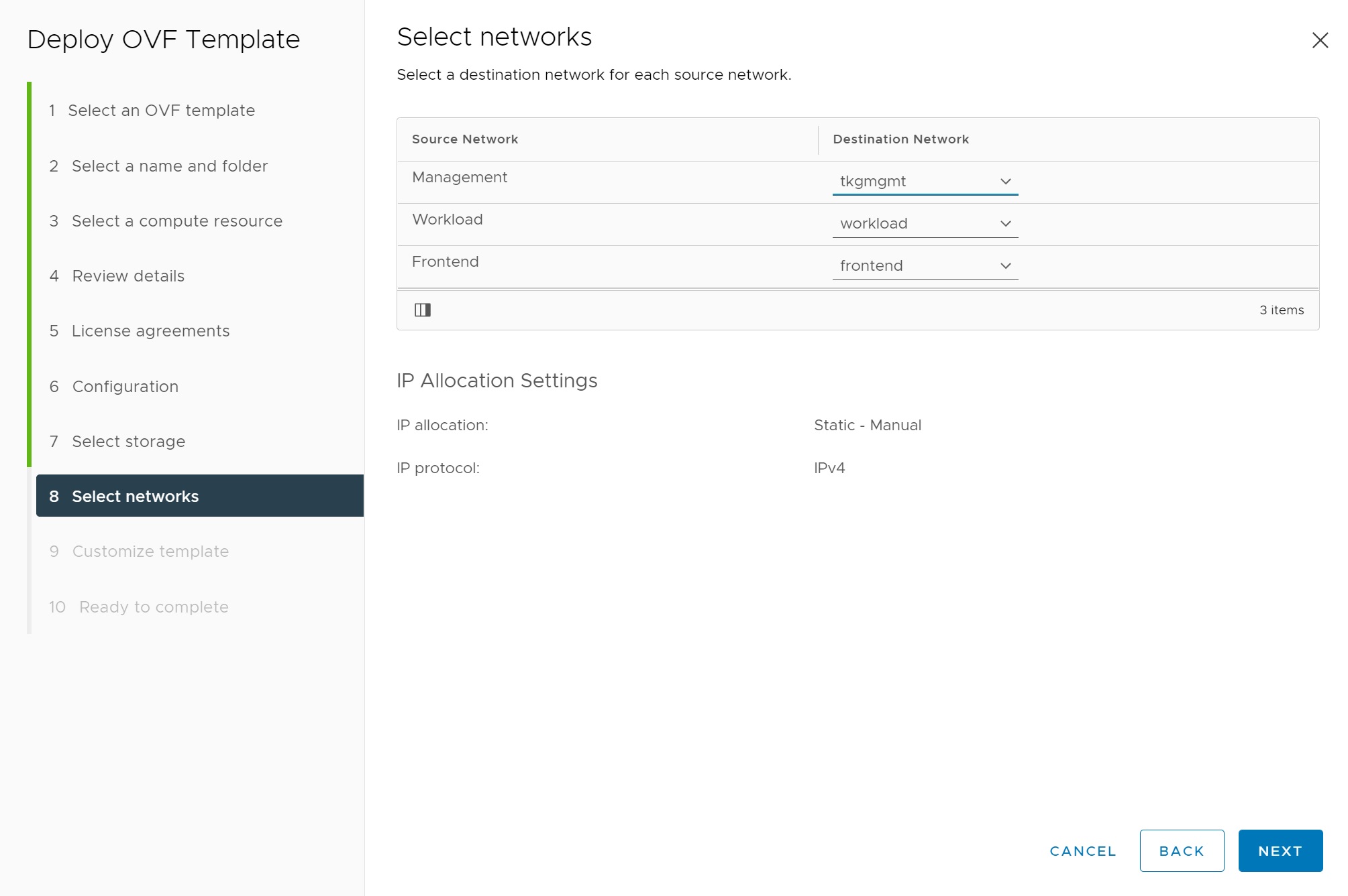 Now we select the three networks (portgroups) we created earlier, matching each one correctly