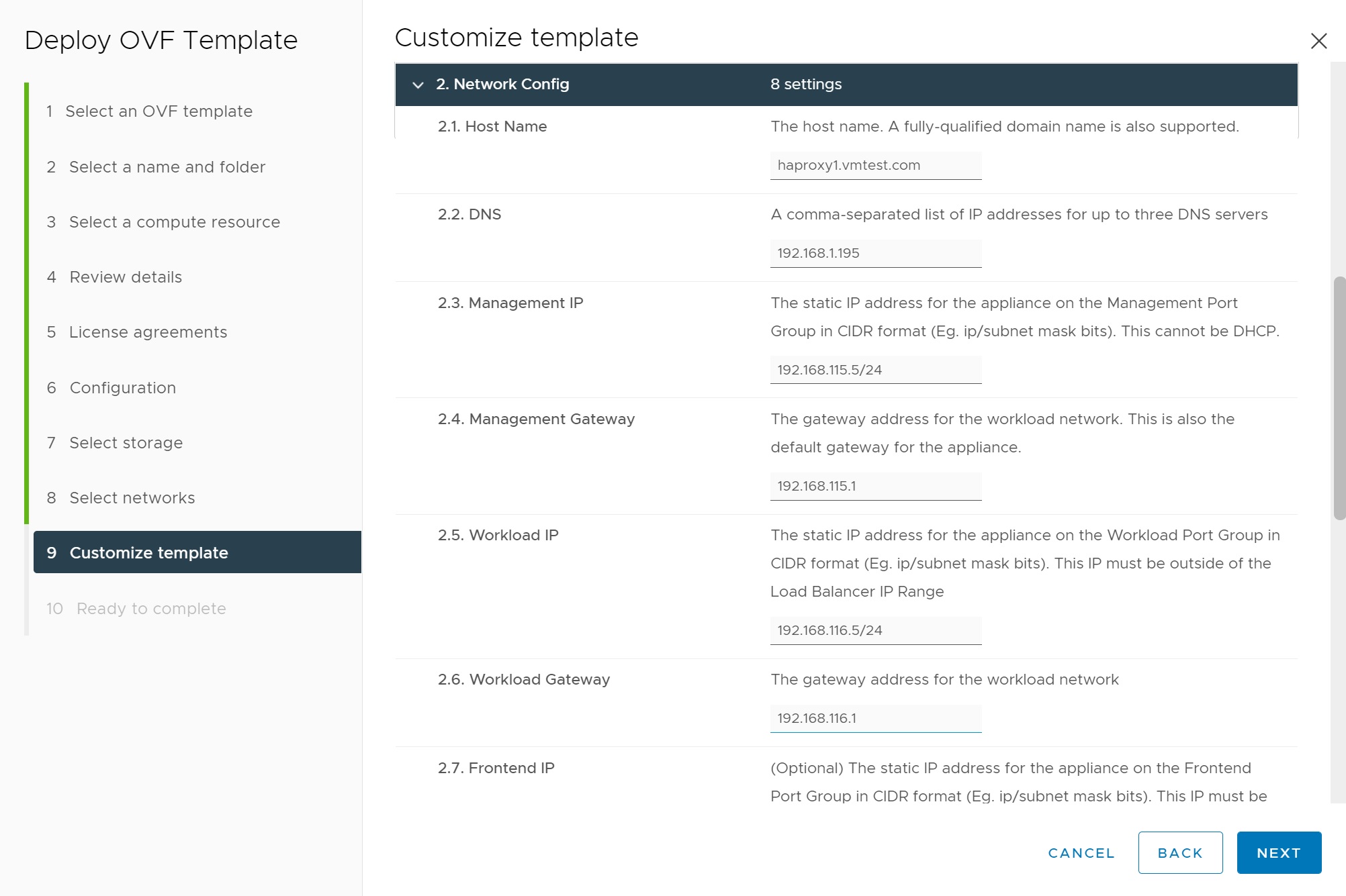 Then we enter the hostname, DNS and the Management network details and the workload network details