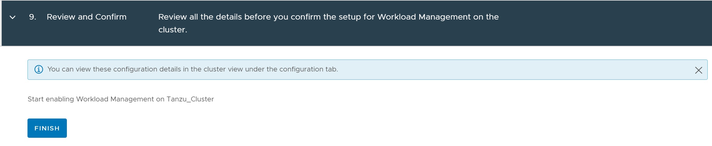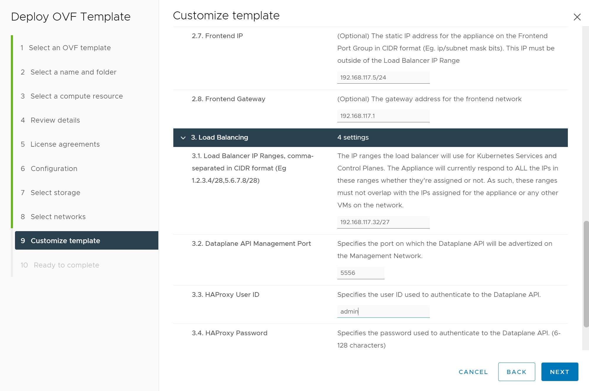 In the network setup screen we select the workload port group enter the gateway, subnet and the IP address range that will be used by the cluster, the IP range will be used to add worker nodes starting at 192.168.116.32