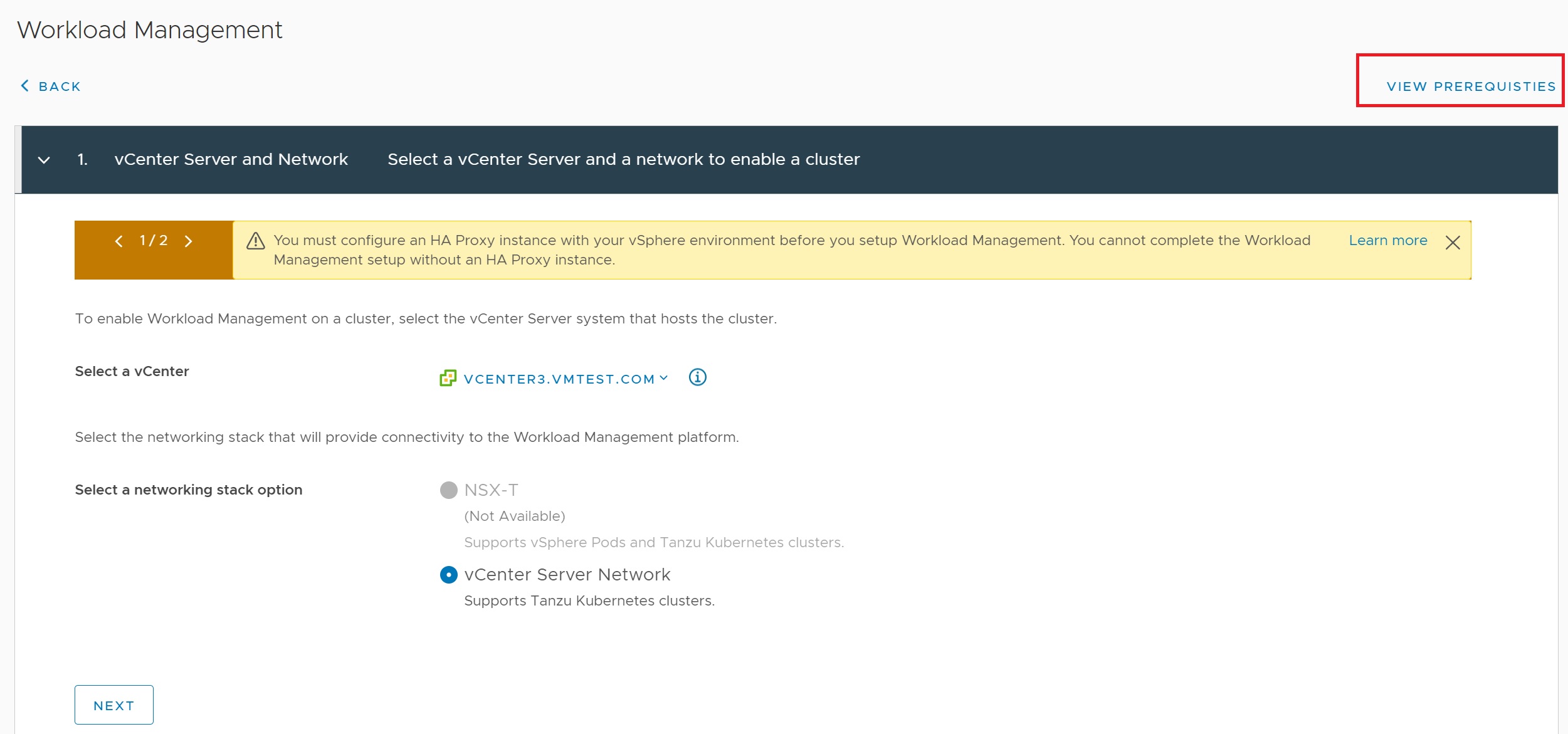 The first screen we select the vCenter and the type of network, you can select the VIEW PREREQUISTIES button to make sure your environment is setup correctly