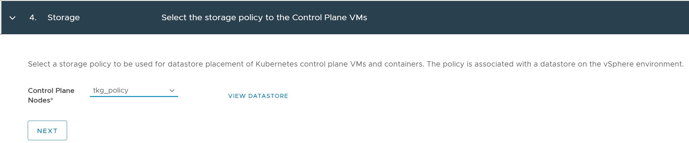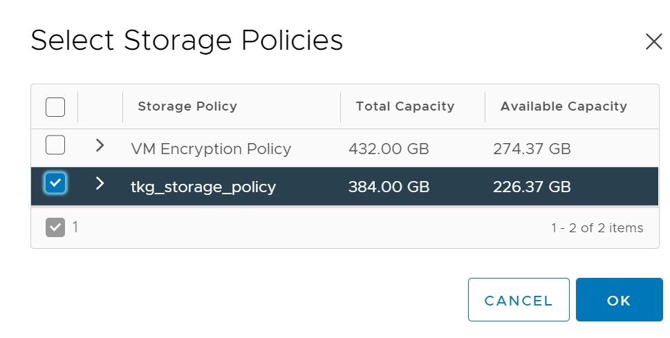 Next we need to setup the storage, click on the ADD STORAGE button and select the tkg_storage_policy we created earlier