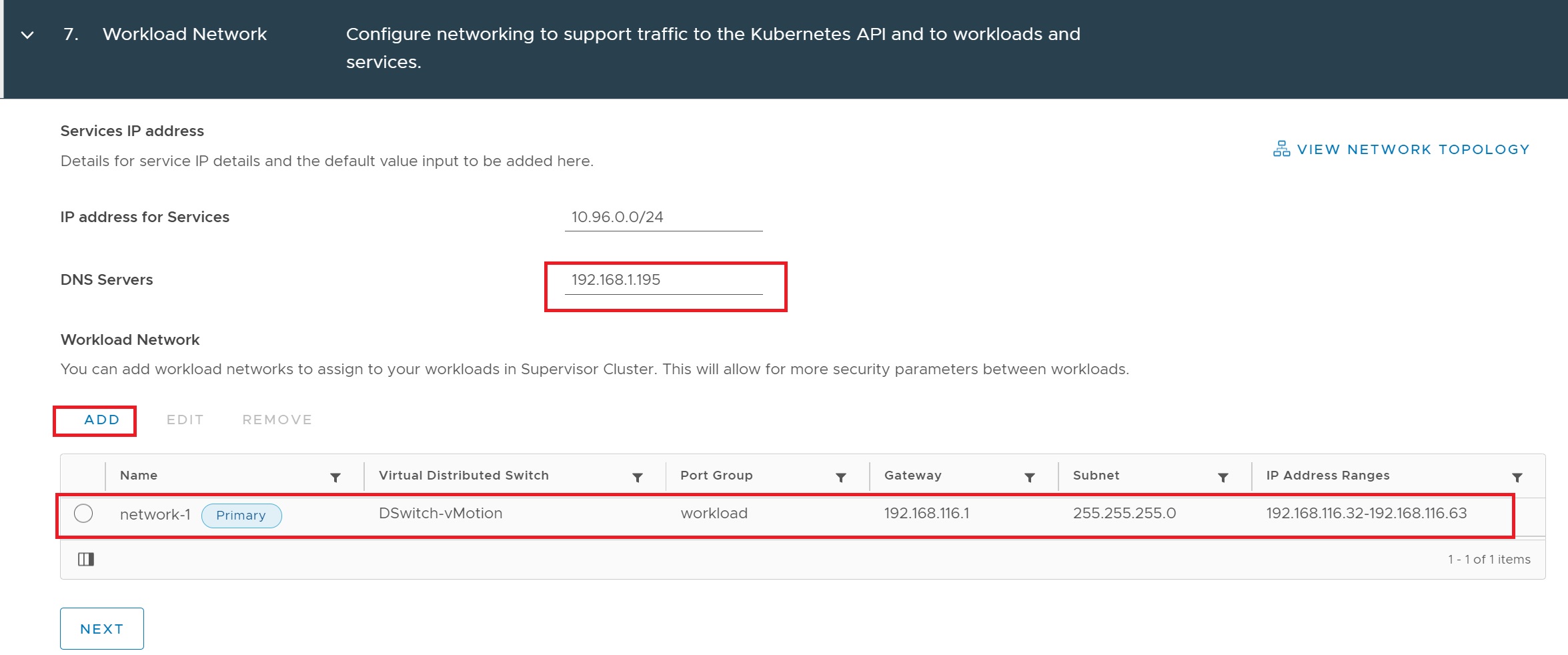 Next we configure the workload network, I left the IP address for services as per the default, then enter the DNS server, we add a network