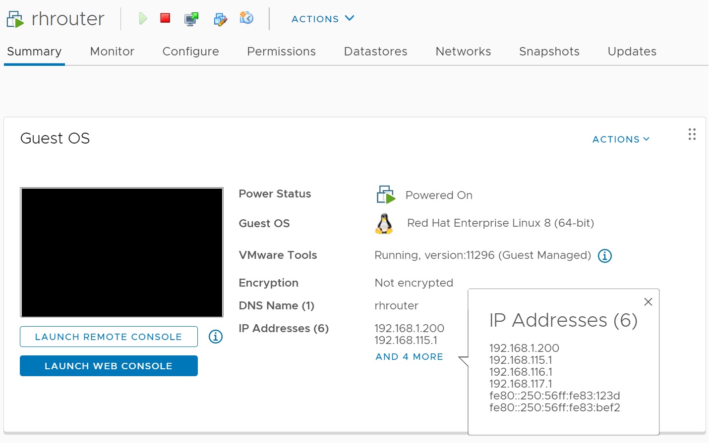 I have setup a basic RedHat server to handle the network routing to the three networks and my main network that I use to access the internet, the HAProxy will use the RedHat router as a gateway to the internet and my internal DNS and the ESXi services. As you can see I have four networks attached.