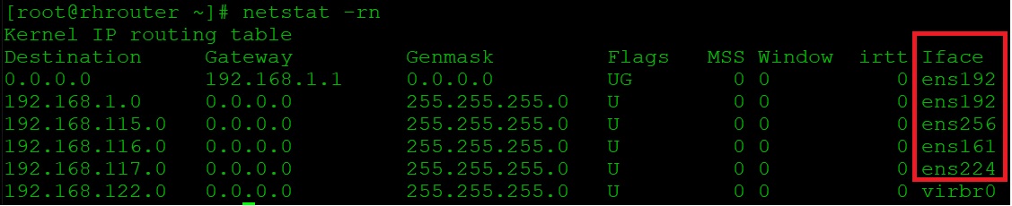 Below is the routing table on the RedHat server its very simple, notice that i have assigned four different NIC's to the RedHat server as you can see the different interfaces