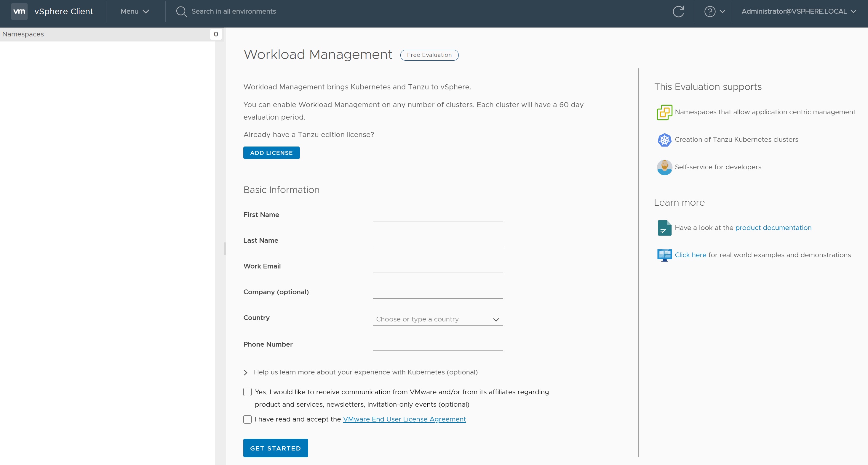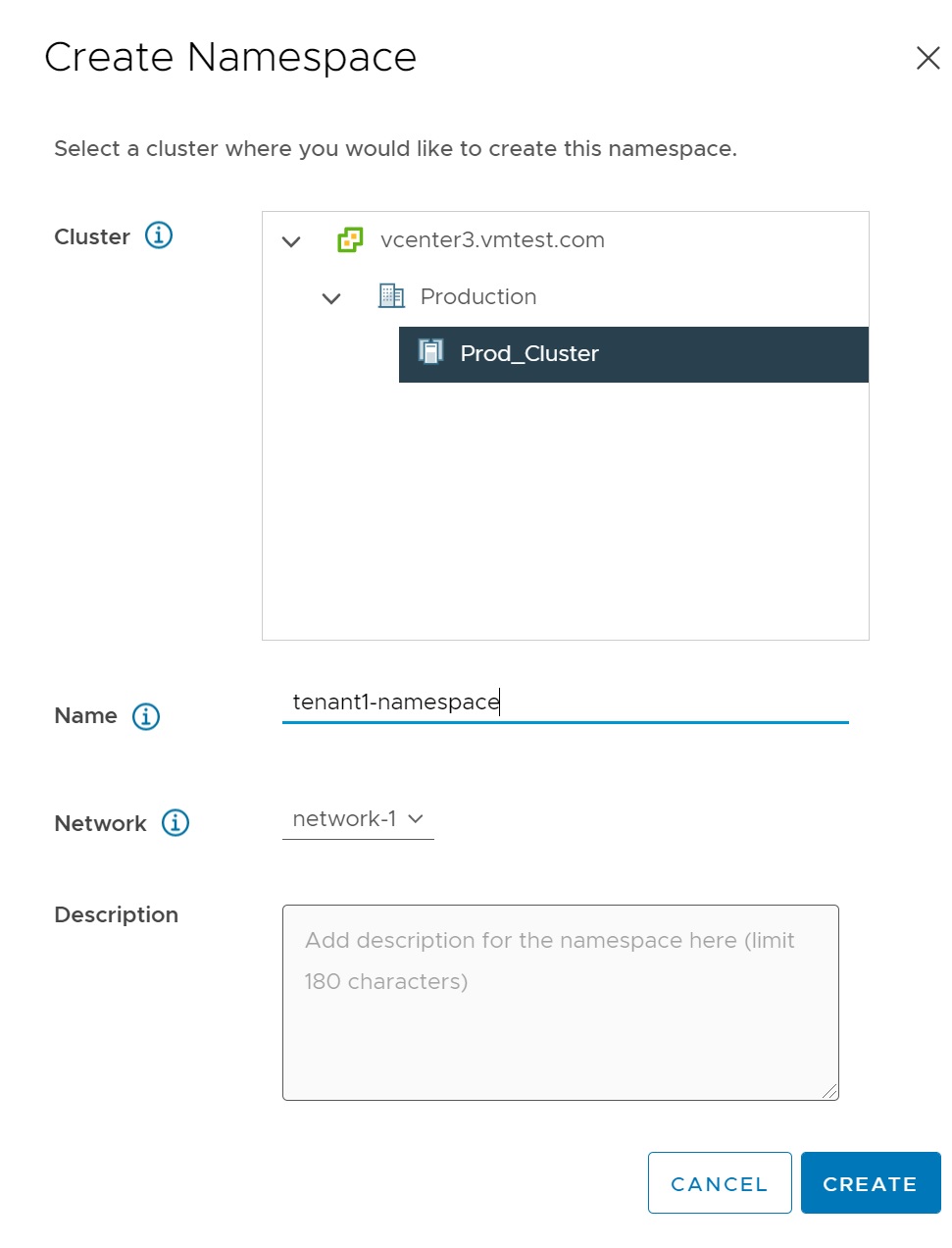 Returning to the WorkLoad Management menu you will be taken to a create namespace screen, this is were you create you namespace clusters that you can view details such as storage, clusters, permissions, etc. Namepaces help you to organize and manage your development projects, you can optionally divide the management cluster into Kubernetes namespaces.