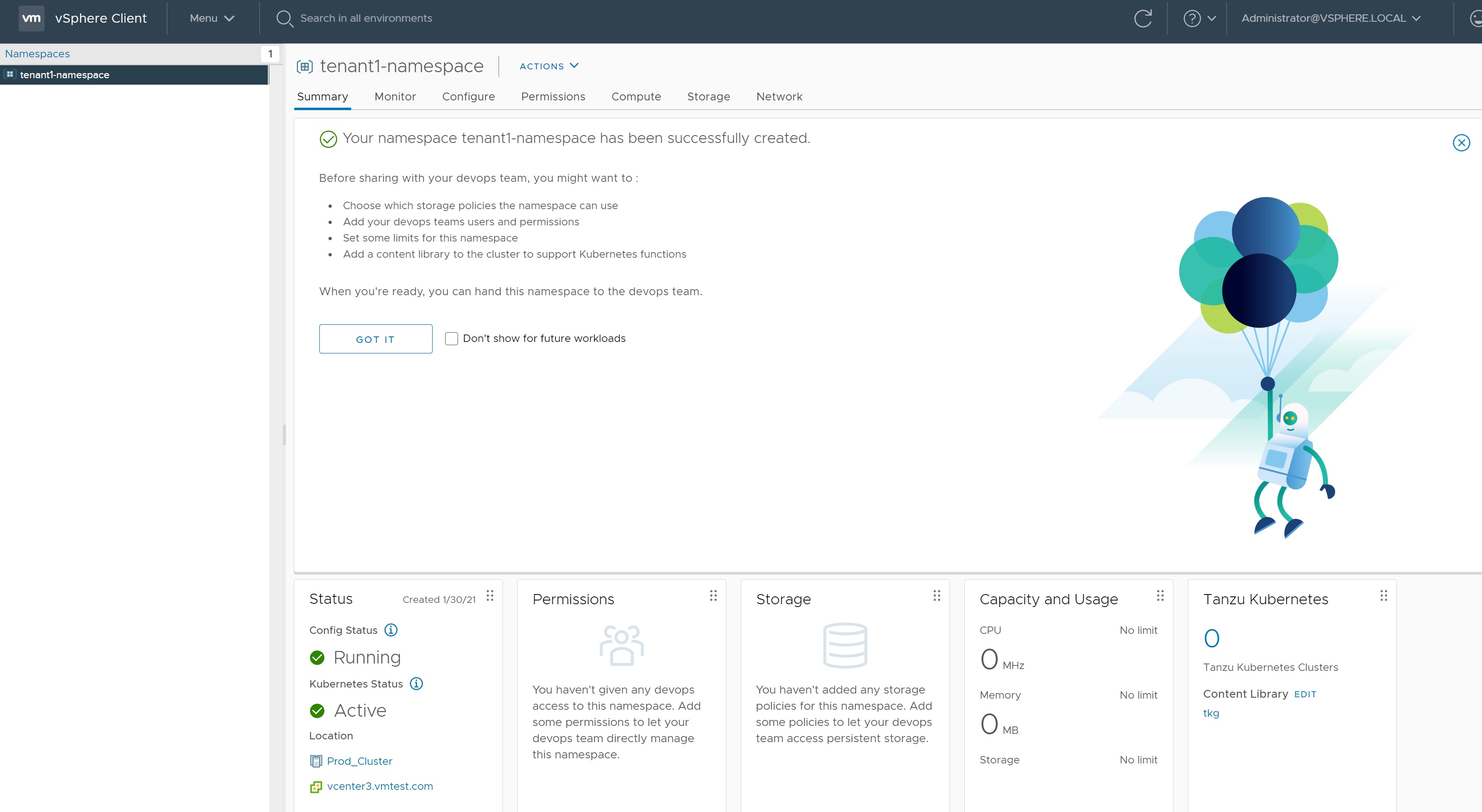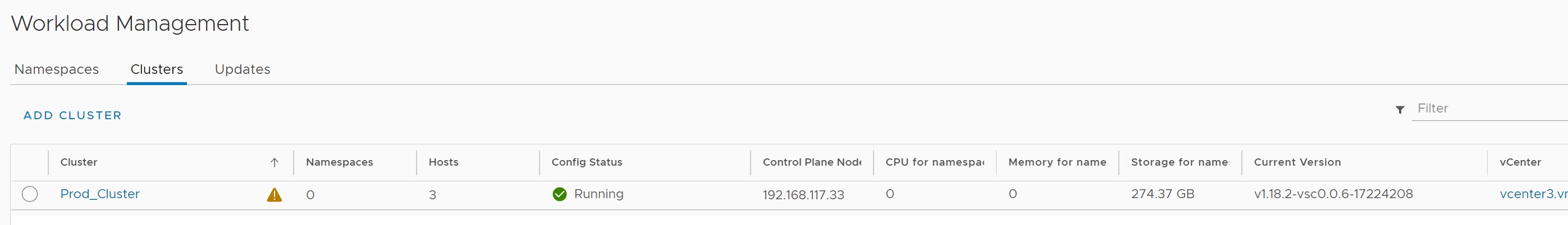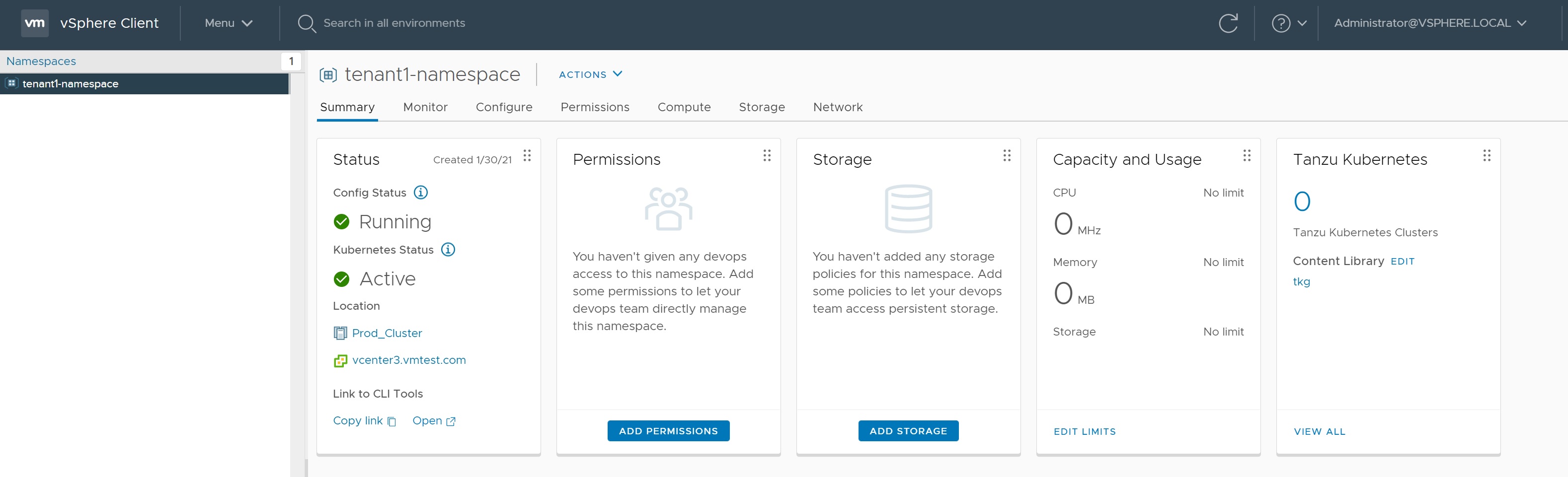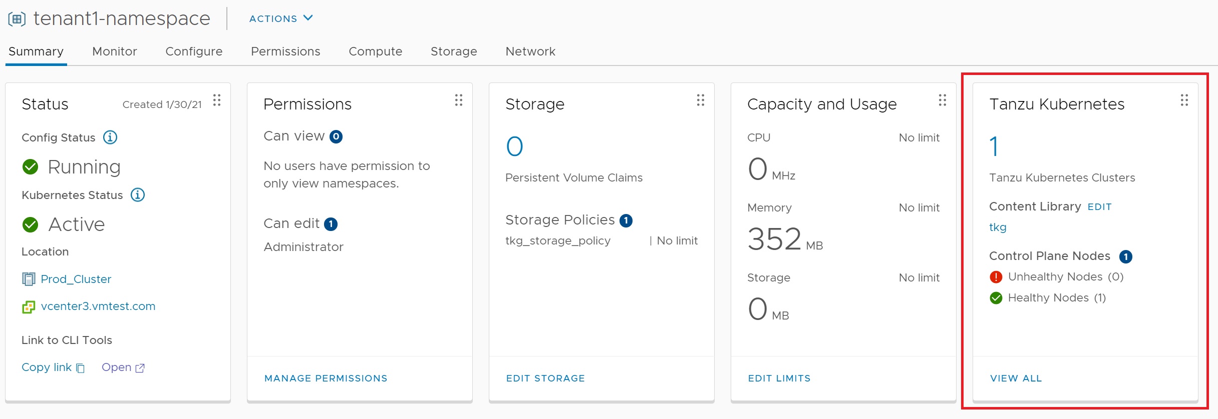 Returning to the workload management -> tenant1-namespace page we can see that we have one Tanzu Kubernetes cluster, select the view all to get more details