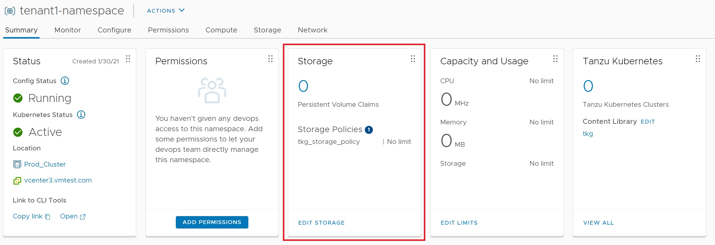 The screen then only details what we need at a glance, at the moment we have no storage for this namespace and no clusters created.