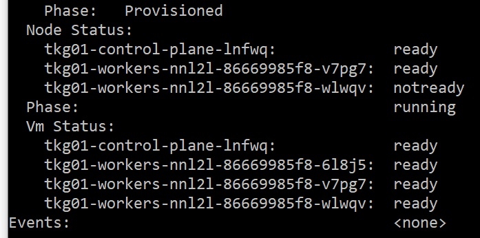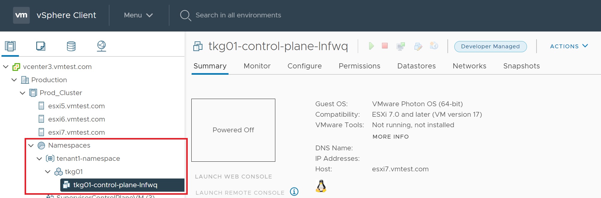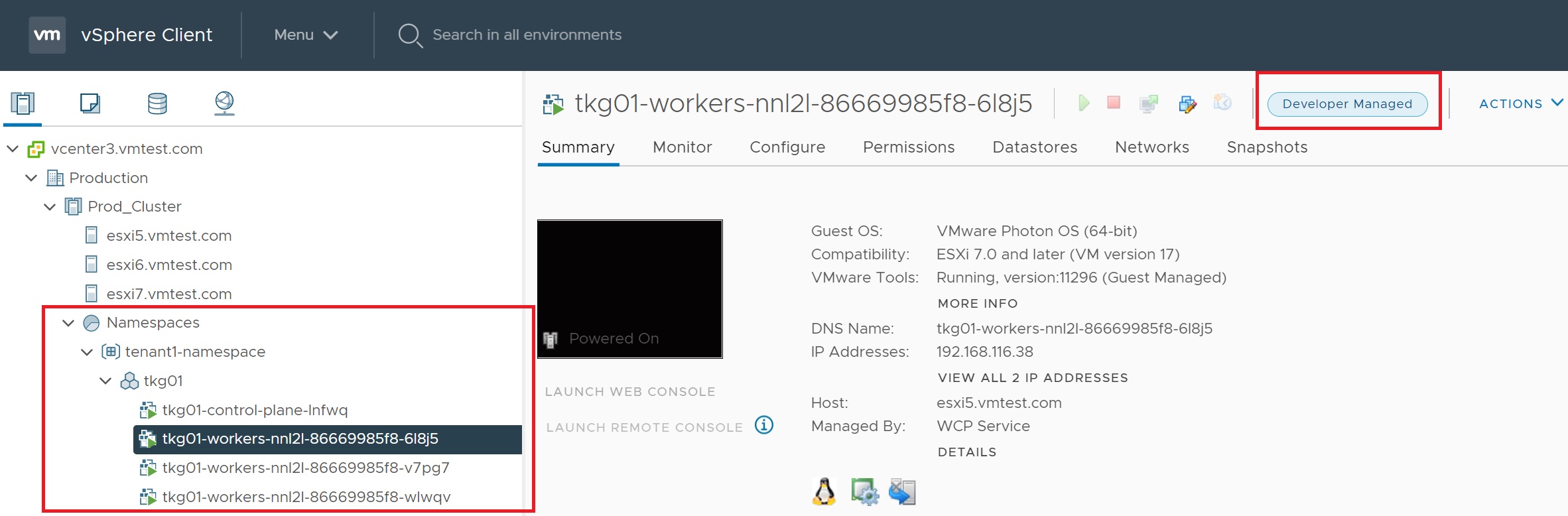 Returning to the vCenter we can see the cluster slowy coming alive, notice the developer managed which indicates that this is a Tanzu workload cluster