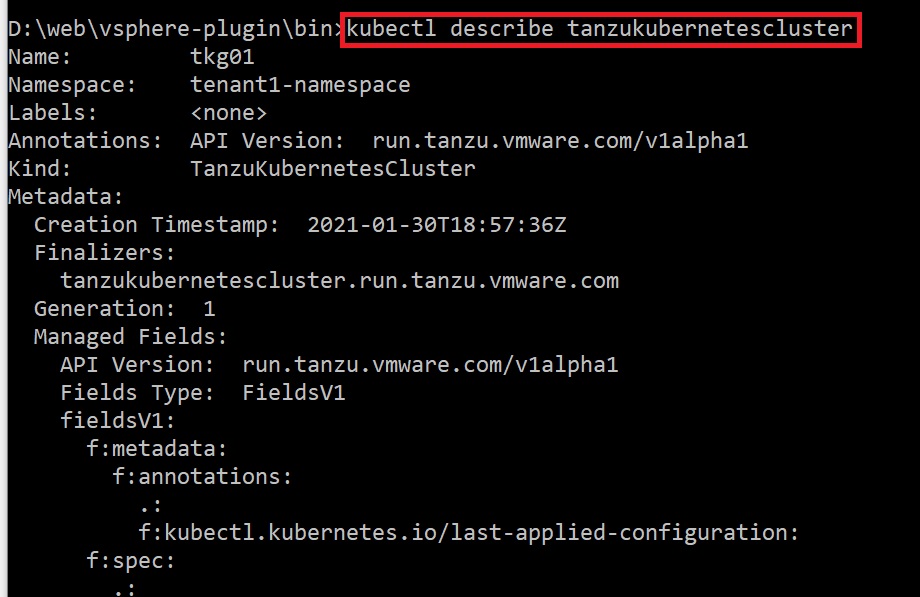 If you click on the virtual machines and use the kubectl command you can see that they match, notice that the kubectl vsphere login command connects directly to the management control plane and then states the cluster and namespace we wish to connect to, also notice that we use the main control plane IP address (192.168.117.33) not the control plane of the tkg01 cluster (192.168.117.34). Once in we can retrieve details about the setup.