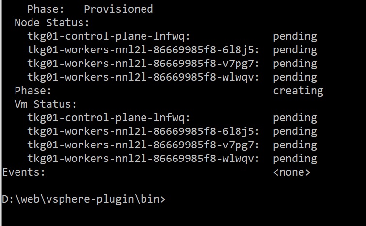 As stated above we then use the kubectl command to apply the configuration and you should get a reply back stating that the cluster has been created, although this is not quite true yet as we will see next